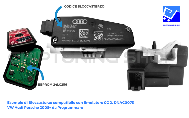Emulatore Bloccasterzo VW Audi Porsche 2008+ da Programmare Verifica che il bloccasterzo sia compatibile (vedi codici sotto) oppure inviaci una foto su WhatsApp Programma l'emulatore con i tuoi strumenti di lettura / scrittura eeprom. Tipo di MCU Bloccasterzo: ESL/ELV MCHC08GR16Tipo di EEprom: 24LC256 GUARDA IL TUTORIAL: COME SI PROGRAMMA L'EMULATORE...